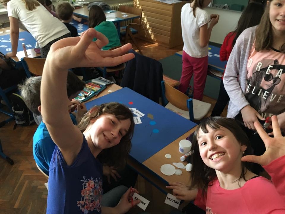 Zbog velikog interesa djece u Češkoj osnovnoj školi J. A. Komenskog naša Tanja Ježabek je svoju radionicu održala dan ranije na opće zadovoljstvo sudionika. Mnoštvo učenika nižih razreda okupilo se kako bi naučili nešto o planetima, zvijezdama i galaksijama. Učenici su na jednostavan, poučan i zabavan način shvatili koje je njihovo mjesto u nečemu ogromnom što se zove svemir. Naučili su da su zvijezde nešto još mnogo veće i zadivljujuće od planeta, da i naš planet zajedno s ostalim planetima Sunčevog sustava ima svoj sićušan ali značajan položaj u galaksiji i svemirskom prostranstvu. Nakon kratkog predavanja učenici su imali prilike sami složiti svoje Sunčeve sustave i reći što znaju o astronomiji i svemiru. Kreativnim pitanjima i dijalogu nije bilo kraja, što je radionicu učinilo još uspješnijom.