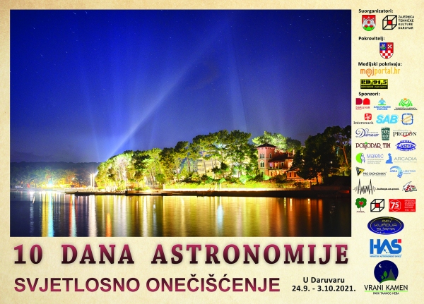 Ovogodišnjih 10 Dana astronomije 2021., prvih nakon neželjene pauze uzrokovane epidemijom korona virusa započinjemo svečanim otvaranjem koje će se održati u petak 24.09. sa početkom u 18:00 sati. Nakon kratkog programa svečanog otvaranja posjetioci će imati priliku razgledati izložbu koju nam je ustupio Hrvatski astronomski savez koja prati nit vodilju ovogodišnje manifestacije a to je svjetlosno onečišćenje. U postavljanju izložbe nam je puno pomogao Dorian Božičević, tajnik Hrvatskog astronomskog saveza, predsjednik ZTK i AD Leo Brenner sa Malog Lošinja. Fotografija koja krasi ovogodišnji plakat 10DA je upravo sa njegovog podneblja, točnije Čikata.